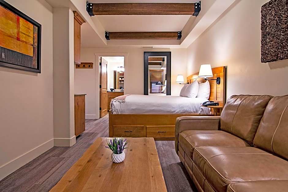 This suite features balcony with a private hot tub, a full-size efficiency kitchen and a fireplace near the bed. The private bathroom has heated floors, a deep tub and a separate glass shower.